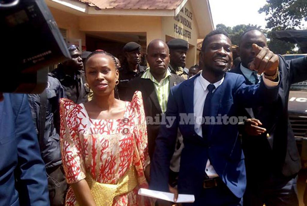 Mr Robert Kyagulanyi Ssentamu and his wife Barbie Itungo (L) shortly after his release from police custody at Kira division police headquarters last Tuesday. Photo by Michael Kakumirizi