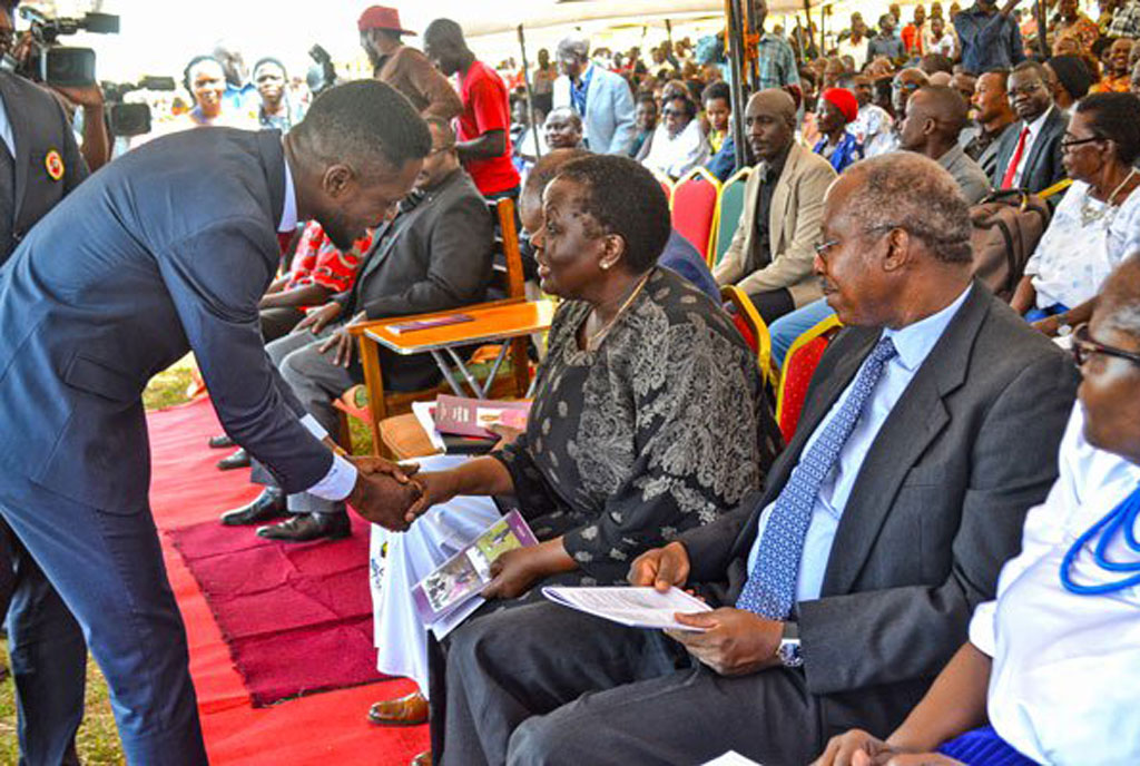 Reaching out. Kyadondo East MP Robert Kyagulanyi greets former vice president Specioza Wandera Kazibwe at the burial of late Bishop Cyprian Bamwoze on Sunday. Photo by Denis Edema