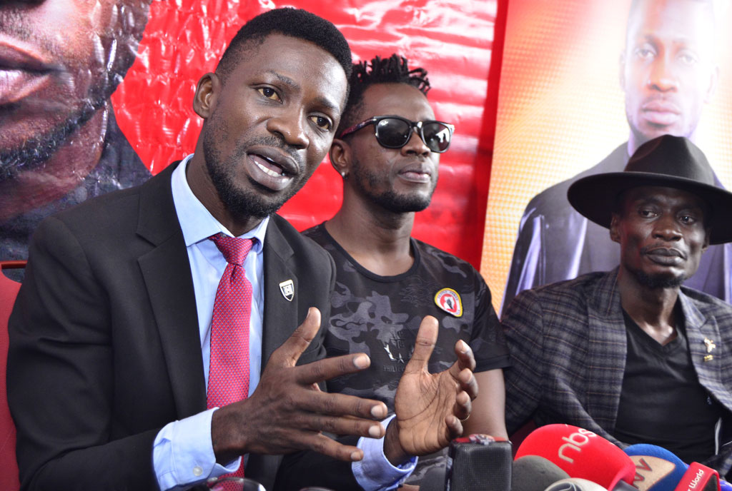 Talk. Bobi Wine (left) addresses the media to announce his concert at Busabala on Easter Monday as fellow musicians Nubian Lee and promoter Abby Musinguzi look on yesterday in Kamwokya, Kampala. PHOTO BY MICHAEL KAKUMIRIZI