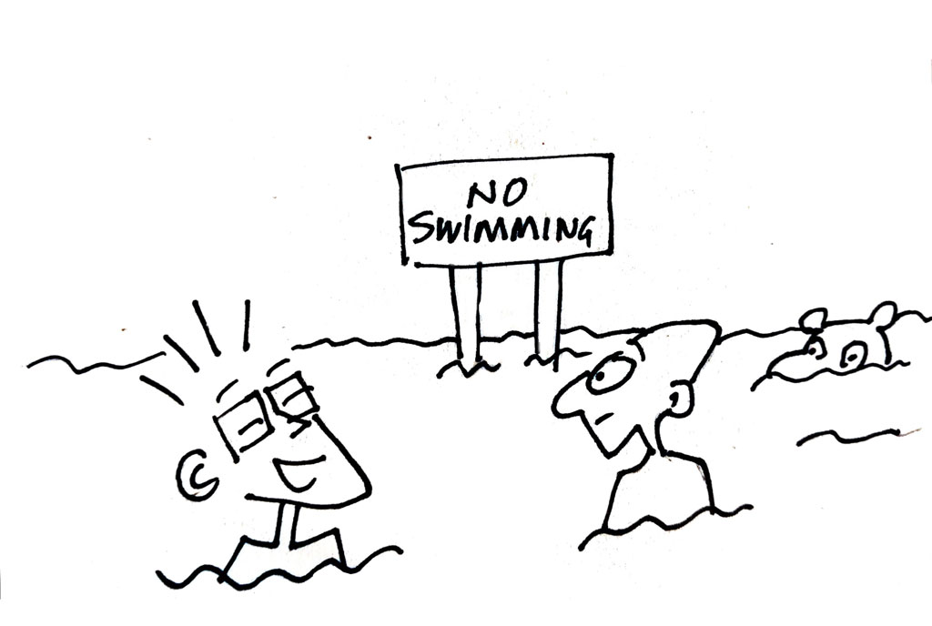 Reminds me of that time we were swimming-swimming in the lake then we saw a sign that said, “No swimming”. So Segamwenge stopped. He was confused. If he wasn’t allowed to swim, how was he going to get back to shore and out of the water?
