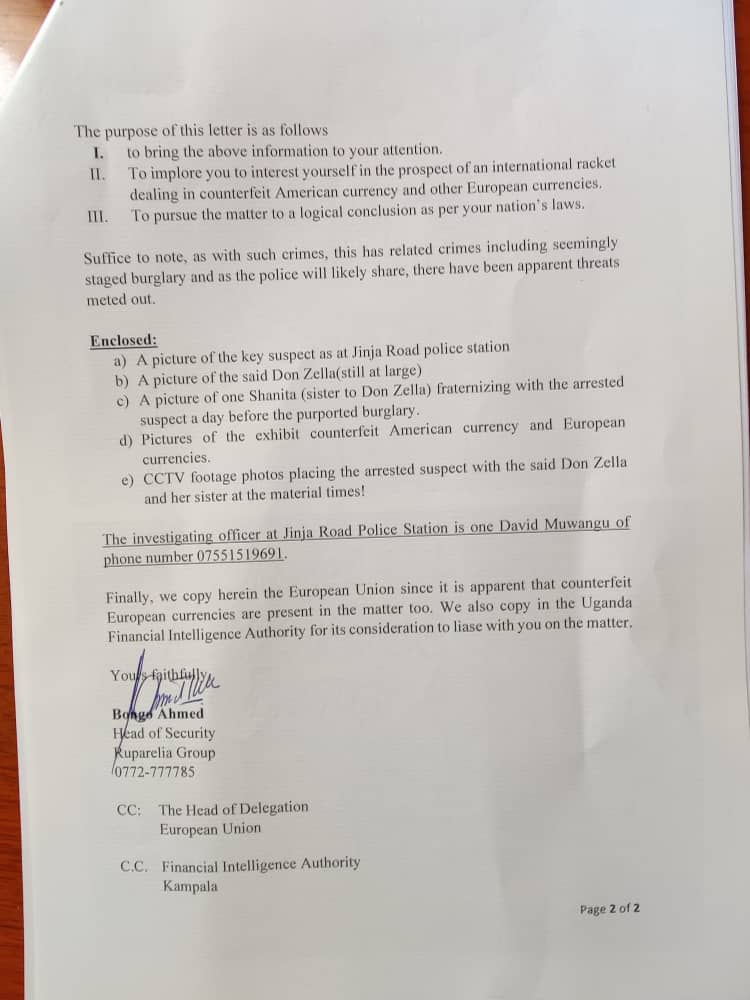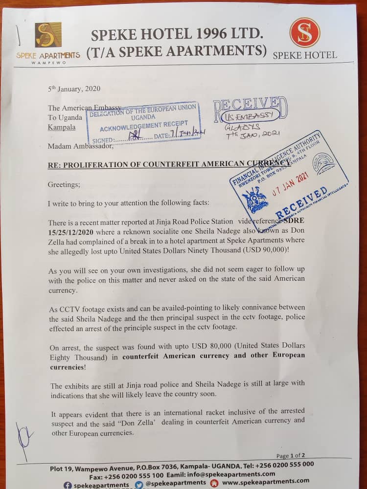 Speke hotel uses the January 05 letter in an attempt to compel the American embassy to probe possibilities of an international racketeering scheme dealing in counterfeit American and European currencies, involving Adome, Don Zella, and others.