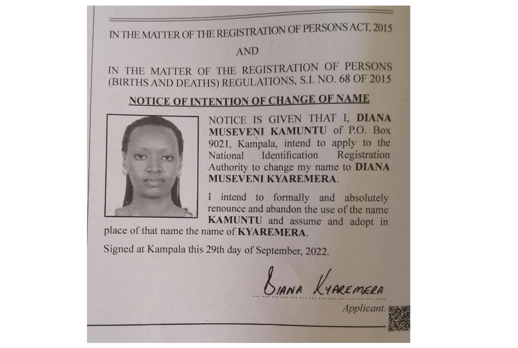 “Notice is given that I Diana Museveni Kamuntu of P.O box 9021 Kampala, intend to apply to the National Identification Registration Authority to change my name to Diana Museveni Kyaremera.”