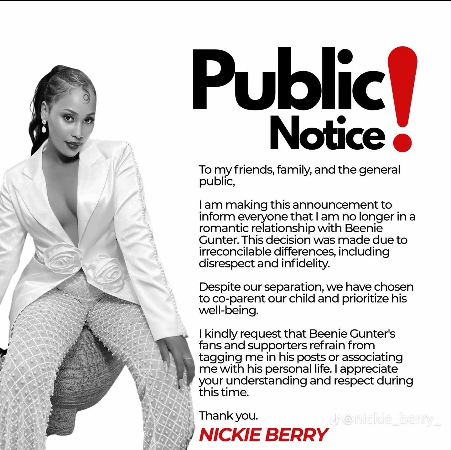 Nickie Berry took to social media to announce the split, revealing the reasons behind their breakup. In her statement, she cited disrespect and infidelity as the primary causes for their separation.